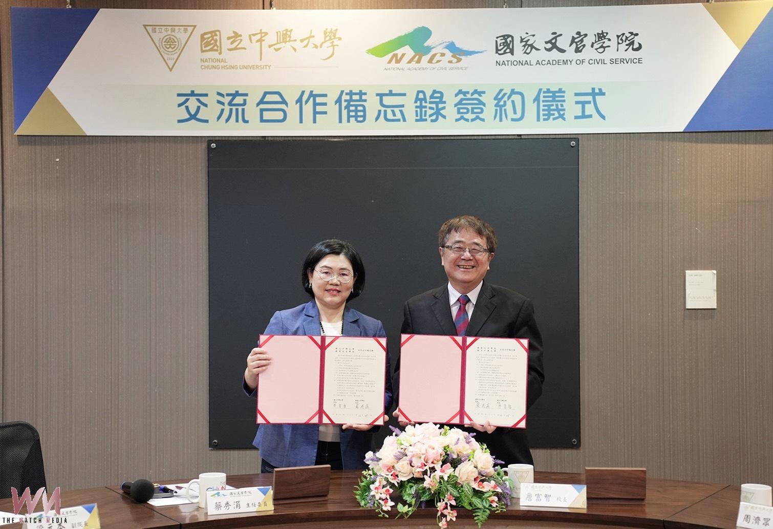 (觀傳媒中彰投新聞)【記者廖妙茜/台中報導】國立中興大學與國家文官學院於25日舉行交流合作備忘錄簽署儀式,由興大校長詹富智與保訓會主委兼國家文官學院院長蔡秀涓代表簽署,雙方將深化高等教育與公務人員培訓體系之交流合作,建立長期合作夥伴關係,透過資源整合與專業交流,提升人才培育品質與培訓效能,為國家公共治理發展注入新動能。