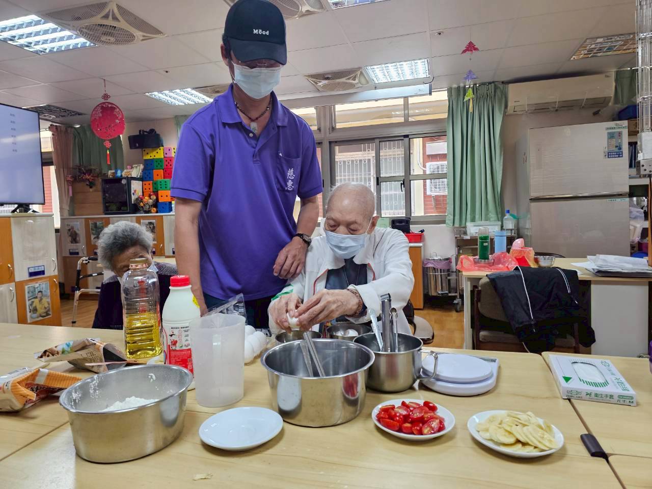 活動開始後,長輩們在照服員引導下分工合作,有的專心攪拌麵糊,有的觀察質地變化,偶爾還分享家中下廚的小秘訣。有人邊攪拌邊笑說:「以前我也常在家做鬆餅呢!」現場不時傳出陣陣笑聲,氣氛既專注又溫馨。