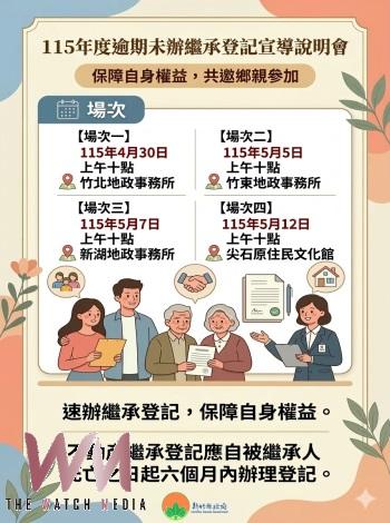 (觀傳媒桃竹苗新聞)【記者金祐妤/新竹報導】根據統計,115年度新竹縣逾期未辦繼承登記的土地及建物,包括有406位被繼承人、3495筆土地與45棟建物,依據公告土地現值計算,土地總價值達18億元,縣府將自4月1日起公告至6月30日;若公告期滿仍未聲請登記,縣府將列冊管理,請相關繼承人多加留意。