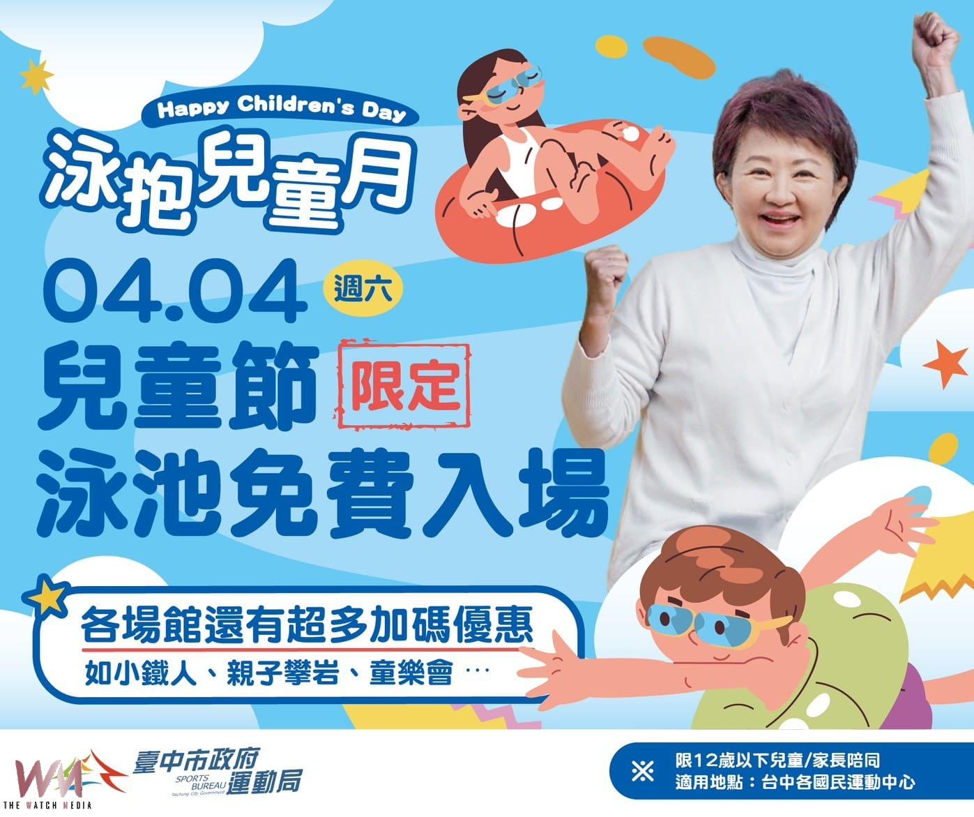 (觀傳媒中彰投新聞)【記者廖妙茜/台中報導】迎接充滿歡樂與希望的4月兒童月,台中市國民暨兒童運動中心在4月4日兒童節推出限定優惠,當天12歲以下兒童可免費使用游泳池,鼓勵家長陪同孩子一起下水運動,在歡樂中培養規律運動習慣,打造專屬親子的運動節日。運動局長游志祥表示,市府今年推出跨局處「台中兒童月」系列活動,運動局特別規劃泳池免費入場優惠,同時為落實安全管理原則,兒童入場須由一名成年家長購票陪同下水,共同守護戲水安全,讓家長安心、孩子開心。