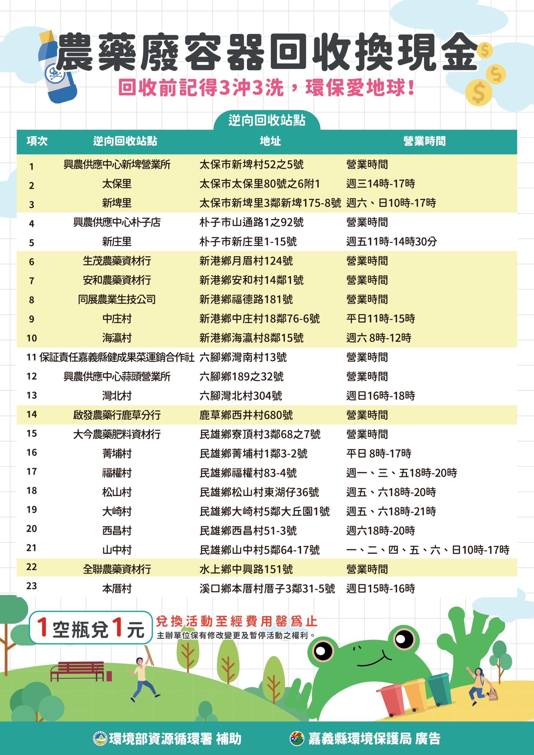 嘉義縣環保局持續推動農藥廢容器回收政策,今年再度辦理「農藥廢瓶罐回收換現金」活動,民眾只要將沖洗乾淨的農藥瓶罐送至指定回收站,即可享有「1瓶兌換1元」的優惠,無論大小皆可兌換,活動經費有限,額滿即止。
