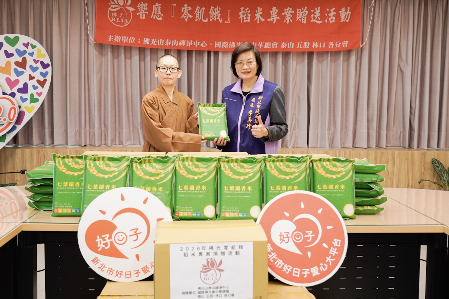 社會局長李美珍表示,新北市社會局與佛光山結緣很深,位於三峽的金光明寺,從104年起就辦理「千歲宴」,關懷長者;106年起更是在每年歲末發起「寒冬送暖、音樂饗宴」,每年幫助上千個家庭。113年起,佛光山首度發起「零飢餓」稻米捐贈給新北市轉贈弱勢家戶。