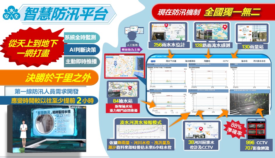 水利局長宋德仁指出,應變必須「唯快不破」。新北市整合淹水感測器、雨量站及CCTV即時影像,導入AI「雨絲辨識」技術,能自動精準判斷降雨強度,讓預警時間較雨量紀錄領先超過16分鐘,使防汛人員能提前至少2小時啟動應變機制。此外,地底污水系統亦同步監控,新北已完成35處污水上游管網液位計,一旦持續降雨使雨水流入污水系統,導致水位上升時,即啟動「提前紓流」機制,全力保護八里污水處理廠及整體管線安全。