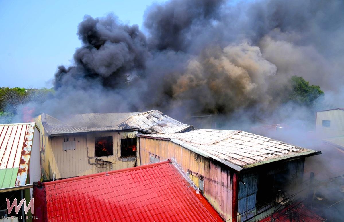 (觀傳媒高屏新聞)【記者陳宗傑/屏東報導】屏東市光復路竹圍巷一棟2層鐵皮屋倉庫今天上午11點發生大火,火勢一發不可收拾,冒出大量濃煙,附近民眾趕緊報案,消防局出動大批人員前往灌救,所幸火勢控制未波及後方樹林及鄰近住宅,經過灌救後火勢已熄滅,目前殘火處理中,所幸無人受傷。