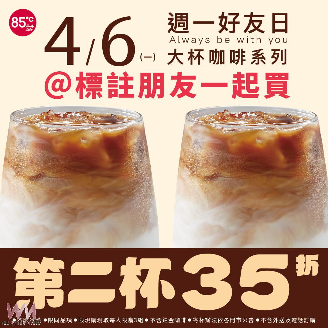 4月6日「週一好友日」限定 85℃大杯咖啡第二杯35折 享受超值優惠 - https://www.watchmedia01.com