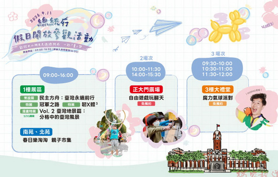 總統府將於4月11日上午9時至下午4時開放參觀,開放區域為:總統府一至三樓,包括:府前廣場、正大門、車廳、2樓敞廳、3樓大禮堂及部分迴廊,以及1樓展場、迴廊、南苑、北苑、郵局、紀念品中心等空間,歡迎全國民眾蒞臨參觀。