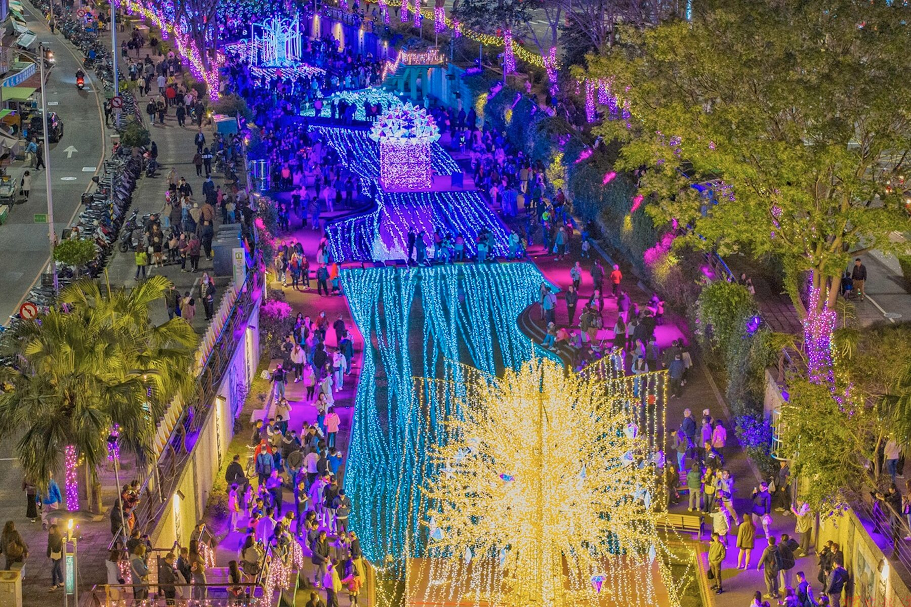 此外,河面上金光閃閃的大風車、繽紛星光隧道,以及極地企鵝等造景,搭配水面上的閃爍倒影,豐富的光影層次吸引大批攝影愛好者,都說為了捕捉這美景「真的要好好練夜拍」。河廊處處是驚喜,無論低頭捕捉水面星光或是抬頭欣賞夢幻造景,隨手拍都能拍出絕美大片。