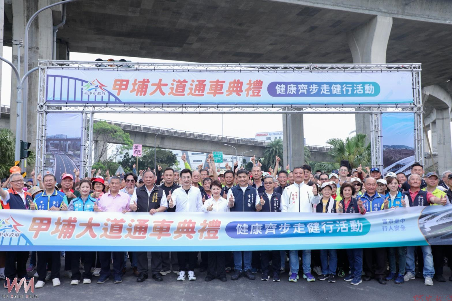 (觀傳媒中彰投新聞)【記者廖妙茜/台中報導】深受海線地區居民期待的「甲埔大道」正式通車!台中市政府表示,市長盧秀燕積極推動地方交通建設,補齊各區重要路網缺口,斥資近16.5億元的「甲埔大道新建工程」全長2.75公里,歷時3年施工,並於今(9)日由盧市長親自主持完工通車典禮。今日典禮市府同時舉辦「健康齊步走」健行活動,邀請民眾徒步從外埔區甲后路四段出發至大甲區中山路一段,身體力行搶先體驗這條串聯大甲與外埔的重大交通新廊帶,感受道路結合鋼構橋梁、自然生態與田園景觀的整體風貌。