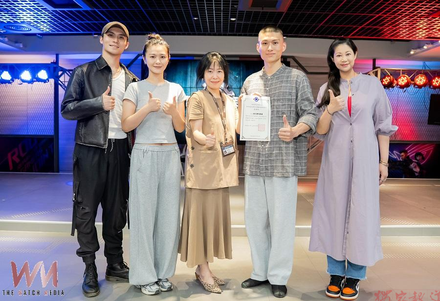 明新科大多媒體與遊戲發展系邀請「當代傳奇劇場」蒞校舉辦藝文講座,人文與設計學院院長趙子嘉(中)、多媒體系張齊軒副教授(右一)與劇團青年世代演員合影,深化藝文教育推廣。(圖/記者金祐妤翻攝)