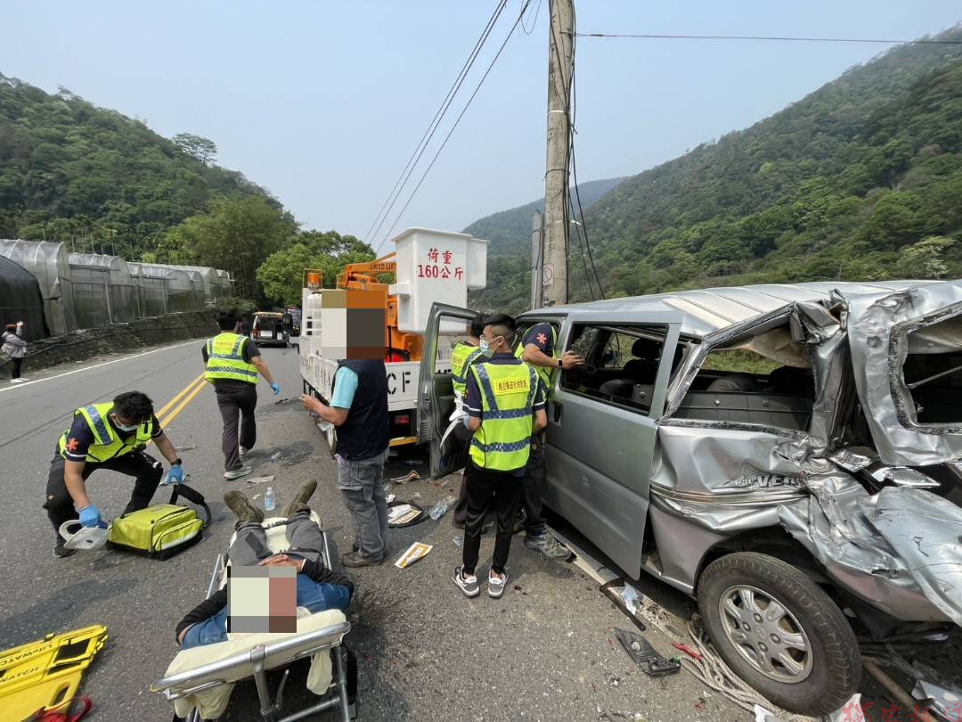 消防局消防人員於10時23分到達現場,經評估患者受困之車輛車門未卡住可順利開啟,便協助車上受困民眾陸續脫困,於10時28分成功將4名受困民眾救出,經初步急救處置後,將4名患者分別送往埔里榮民醫院及埔里基督教醫院。消局呼籲民眾駕駛車輛時,應隨時注意車前路況,遇有狀況應提早減速以免發生危險。(圖/記者石振賢翻攝)