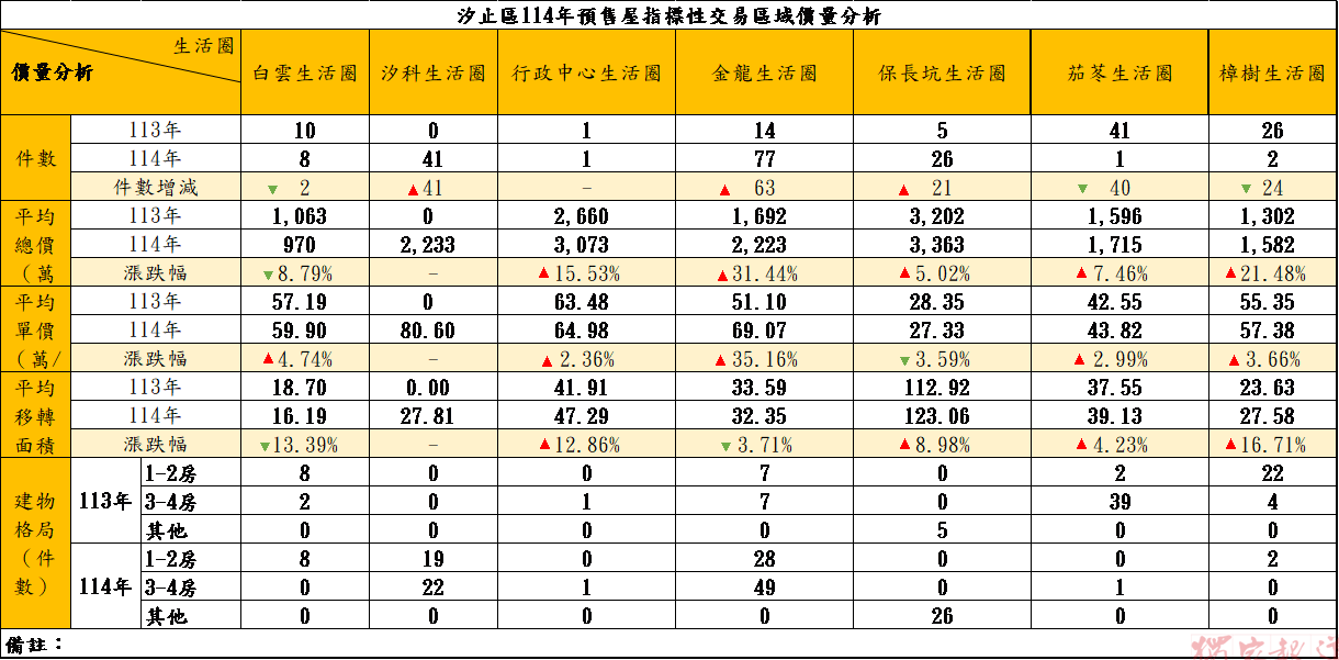 汐止地所補充,114年度汐止區預售屋市場大致呈現價量俱增情況,若民眾想進一步了解生活圈內各建案詳細統計數據,或掌握汐東線各站周邊房市行情,歡迎至該所網站(業務專區/實價登錄專區/實登加值應用)查閱完整統計資料並多加參考。