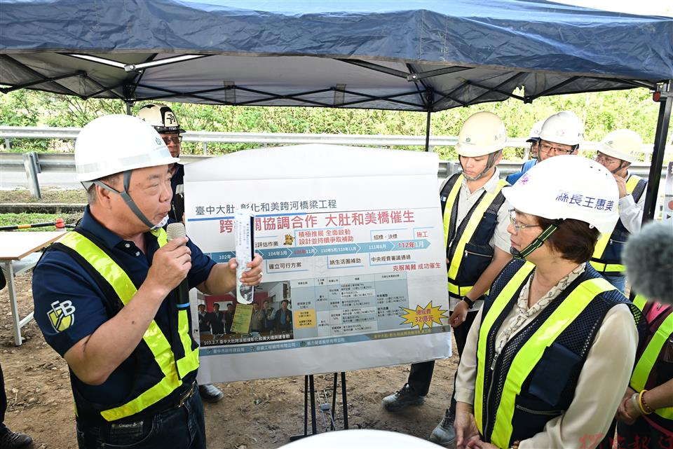 她指出,該工程她於擔任立委期間即積極爭取推動,橋梁自臺中大肚端銜接彰化和美,全長約1,690公尺,其中主橋長約1,440公尺,橋寬22公尺,規劃雙向4車道、2機車道及人行與自行車共用道。目前工程進度已接近89%,施工團隊持續推進並兼顧工安。