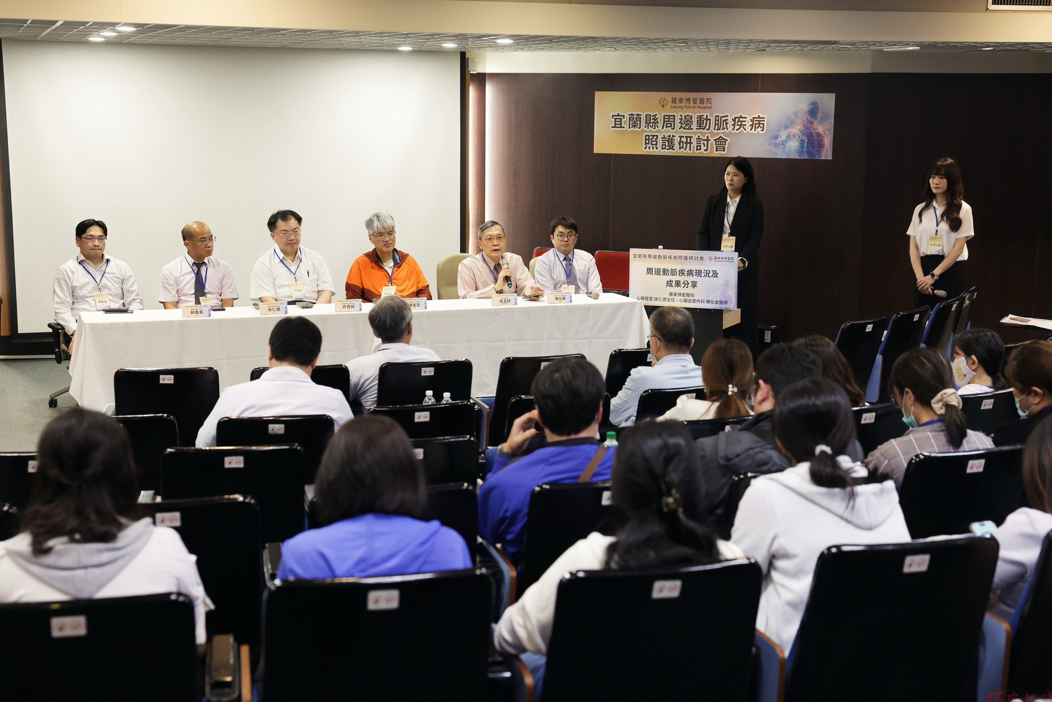 徐仁德解釋,周邊動脈疾病成因是動脈粥狀硬化導致血管狹窄,致使下肢供血不足;初期可能出現步行時腿部抽痛、麻木且腳部傷口難癒合等症狀,常被誤認為筋骨痠痛,若無病識感可能被忽略而延誤治療,最終落得截肢後果。為提高疾病照護品質、進而減少截肢機率發生,羅東博愛醫院邀請林口長庚醫院心血管導管中心陳俊吉主任,以及宜蘭地區基層診所醫師參與疾病研討會,心內外科、整形外科與高壓氧中心等專科團隊也一同與會,互相交流對周邊動脈疾病的治療經驗。期望第一線社區醫師能與醫院合作,診所醫師成為前期的「偵探」,及早發現疾病並將潛在病人轉診至醫院。