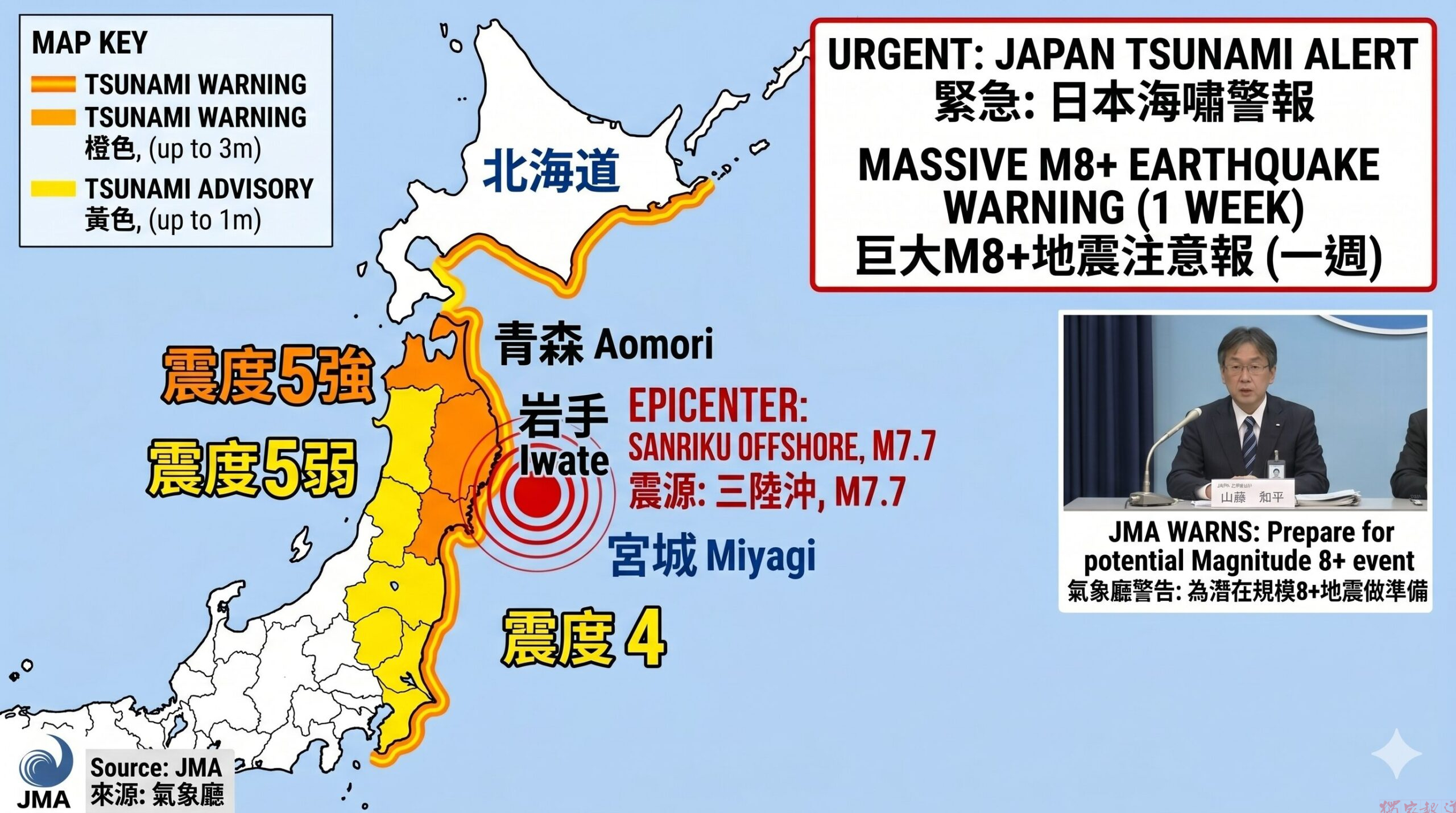 日本東北與北部地區於週一傍晚遭遇規模 7.7 強烈地震襲擊,引發太平洋沿岸長達數小時的海嘯警戒,並觸發了日本政府極為罕見的「巨大後發地震」預警機制。