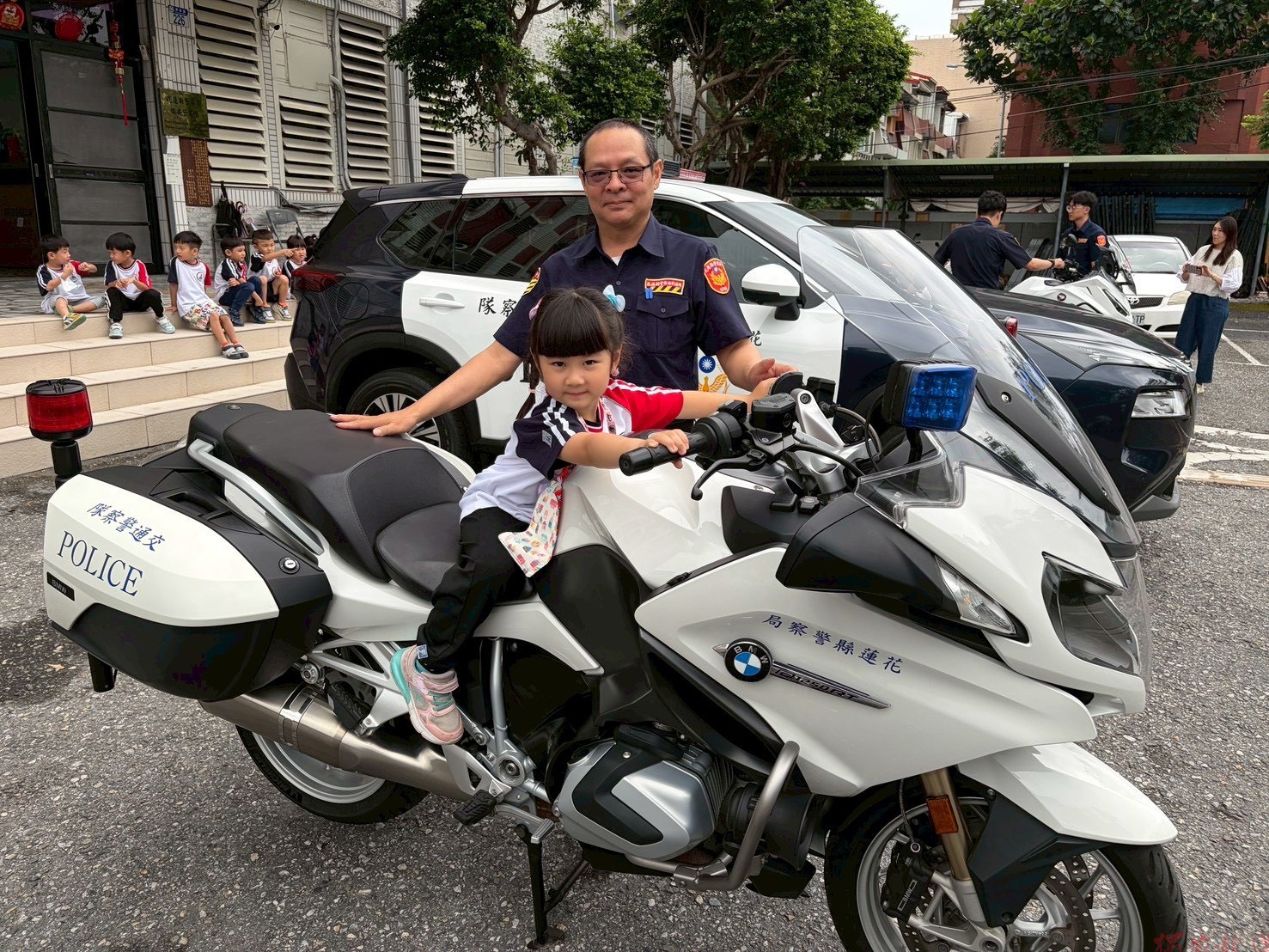 最受幼兒期待的環節則是「警車與警用重機展示」,縣警局交通隊警員詳細介紹警車的功能,並讓幼兒們實際坐車體驗。此外,帥氣的警用重型機車也吸引眾人目光,幼兒開心地拍照留念。