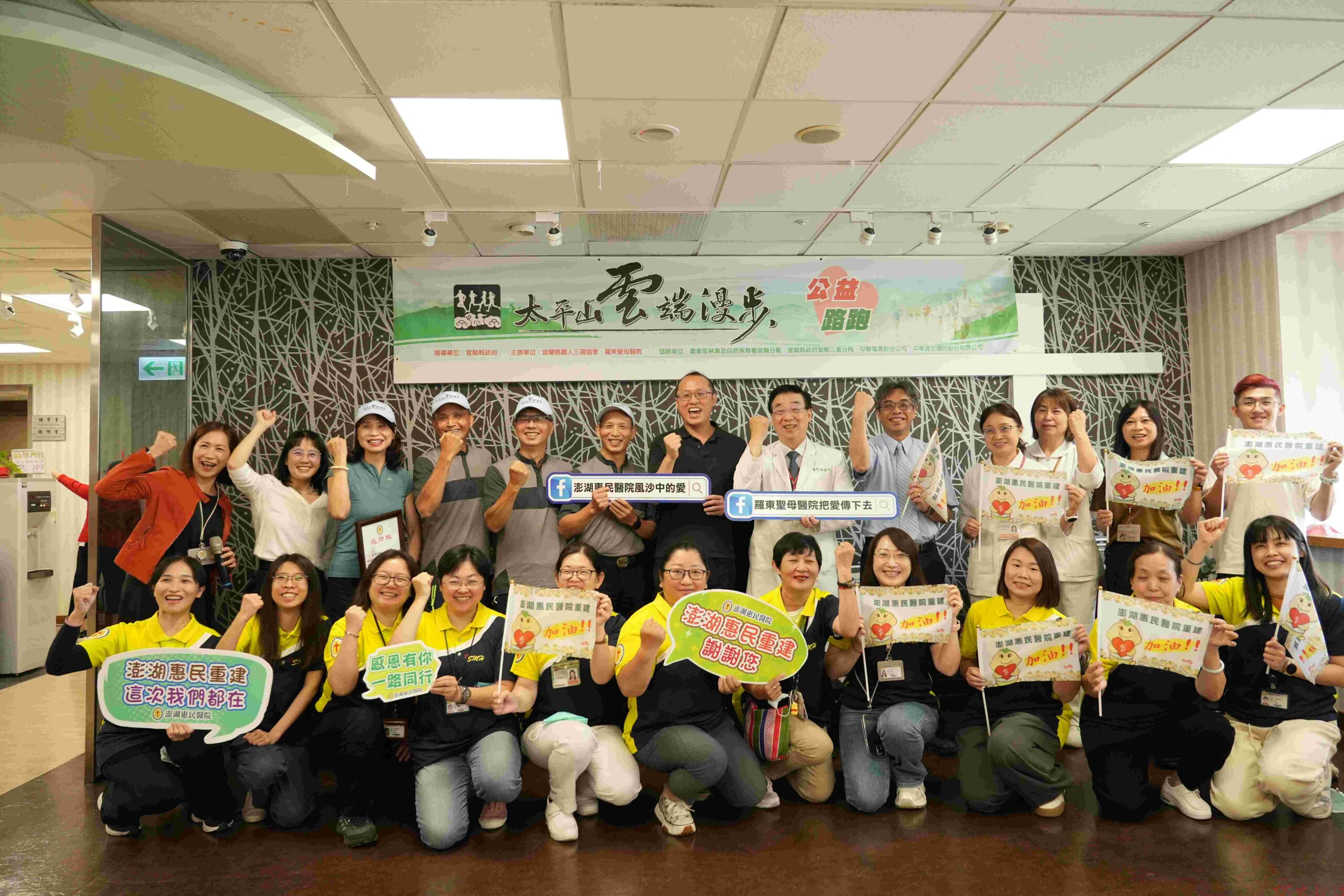 全台最具特色的山林路跑活動「太平山漫步雲端公益路跑」,6月6日在 太平山森林遊樂區、太平山莊及翠峰林道盛大舉行,活動由宜蘭縣鐵人三項協會及羅東聖母醫院聯合主辦,今年賽事延續三年前承諾,持續推動「為澎湖而跑」公益行動,協助澎湖惠民醫院重建計畫。主辦單位表示,該院目前尚缺重建經費1.1億元,今日先行捐贈新臺幣8萬元,並規劃於活動當天透過現場義賣及晶片回收等方式,號召跑友一同參與公益,將愛心送往離島地區。