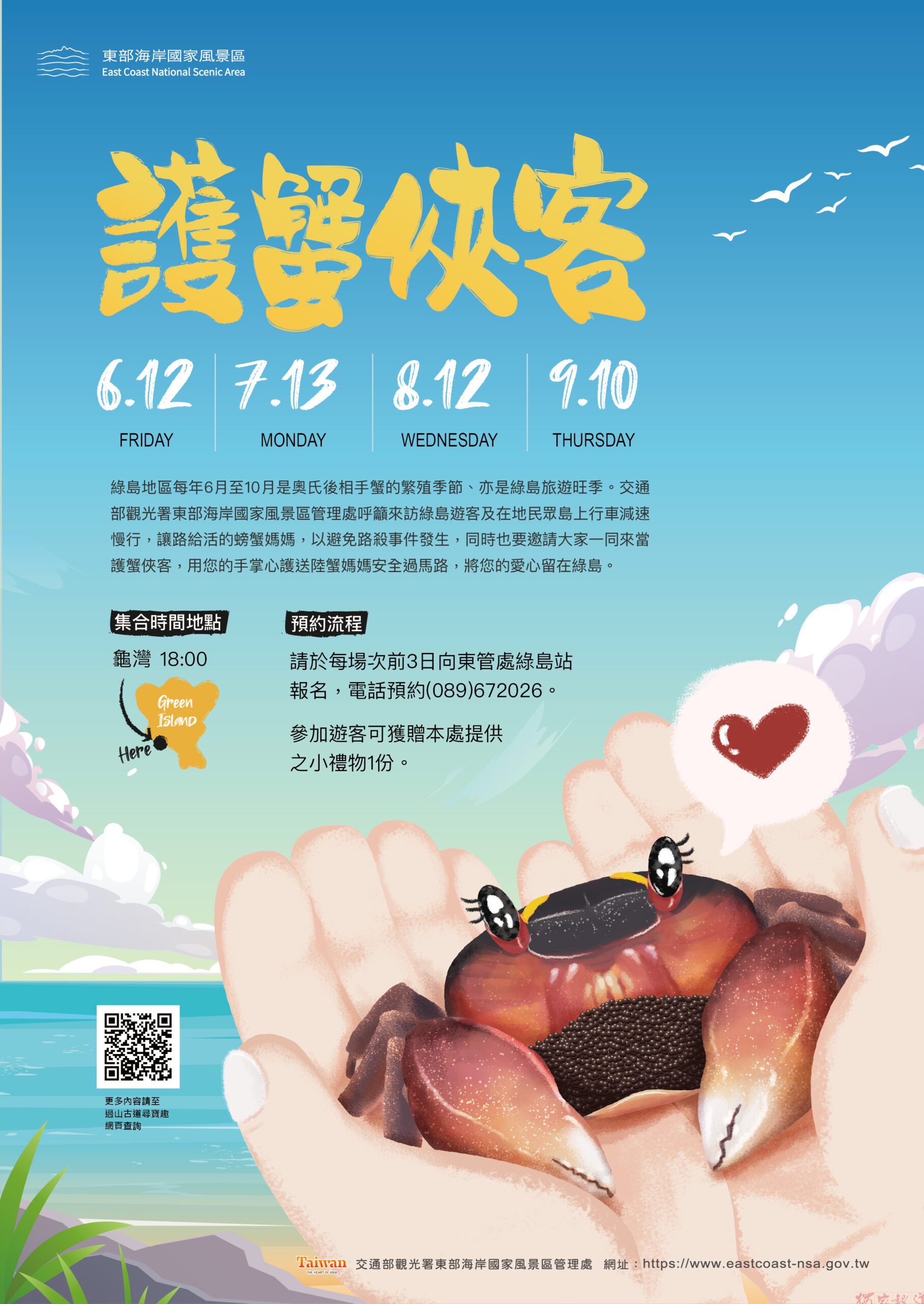 2.「蟹蟹您的愛~護蟹俠客行」:115年6月12日、7月13日、8月12日、9月10日共4場。集合地點在環島公路龜灣路段,集合時間為18:00。