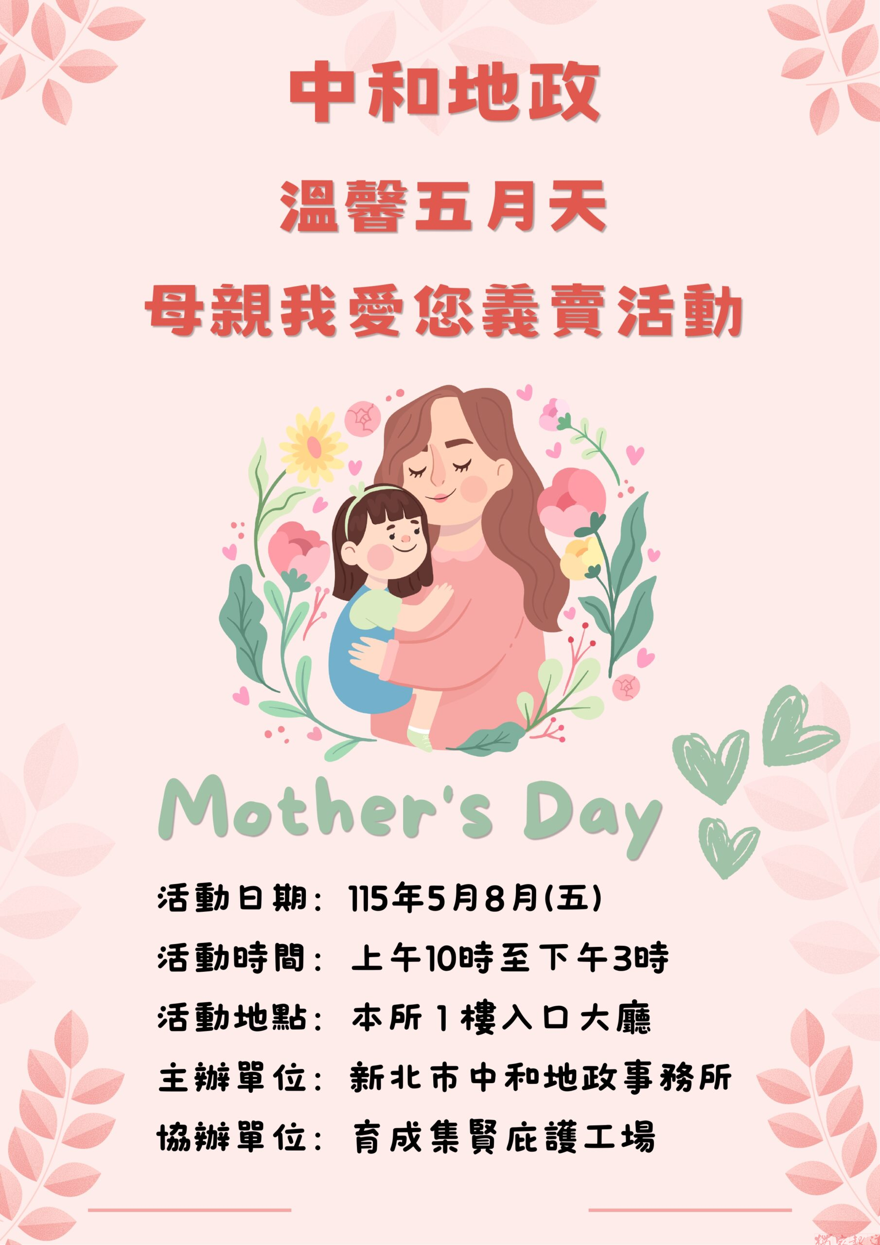 「把愛說出口,傳遞感恩心」,在母親節時送一份禮物給最親愛的媽媽,表達對媽媽無限的愛及感謝,新北市中和地政事務所將於115年5月8日(星期五)上午10點至下午3點舉辦「母親我愛您感恩義賣活動」,同時為協助弱勢團體,是日將邀請財團法人育成社會福利基金會─集賢庇護工廠擺設攤位義賣,歡迎民眾踴躍參加!