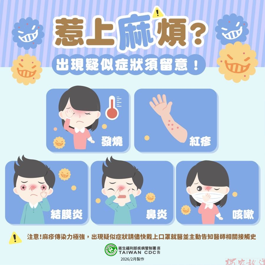 疾管署提醒,麻疹傳染力非常強,可經空氣傳播,接種疫苗為預防麻疹最有效的方法,提醒民眾應按時帶幼兒接種麻疹、腮腺炎、德國麻疹混合(MMR)疫苗,另因經接種疫苗所產生的免疫力可能會隨時間而降低,建議1966年(含)以後出生的成人,近期如計畫前往麻疹流行地區,可於出國前2至4週至旅遊醫學門診諮詢醫師自費接種MMR疫苗。孕婦及未滿1歲嬰幼兒為感染高危險群,應避免前往流行區;如須攜6個月以上未滿1歲的嬰兒前往,可於出發前帶幼兒至衛生所或旅遊醫學門診諮詢自費接種1劑MMR疫苗。出國期間並應注意個人衛生,勤洗手,避免觸摸口鼻,並適時佩戴口罩,以降低感染風險。