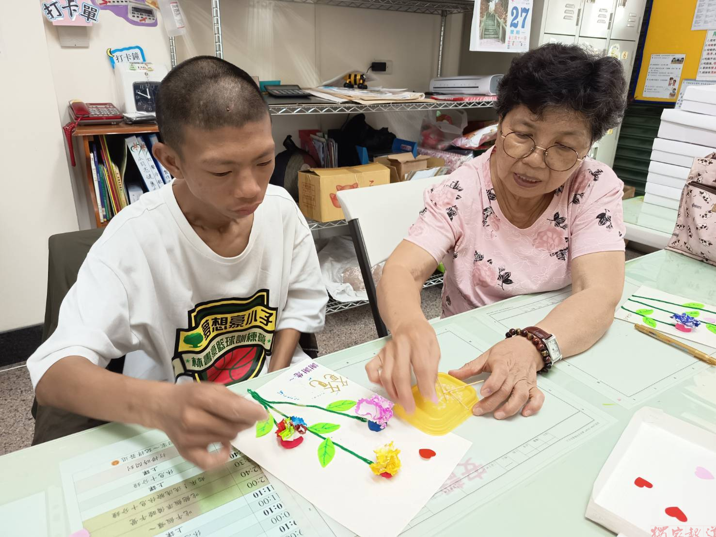 「小太陽工坊」則規劃康乃馨花束製作活動,服務使用者在手作過程中培養專注力與手部精細動作,並將完成的花束帶回家贈送給媽媽,將平時不易說出口的情感轉化為具體行動。