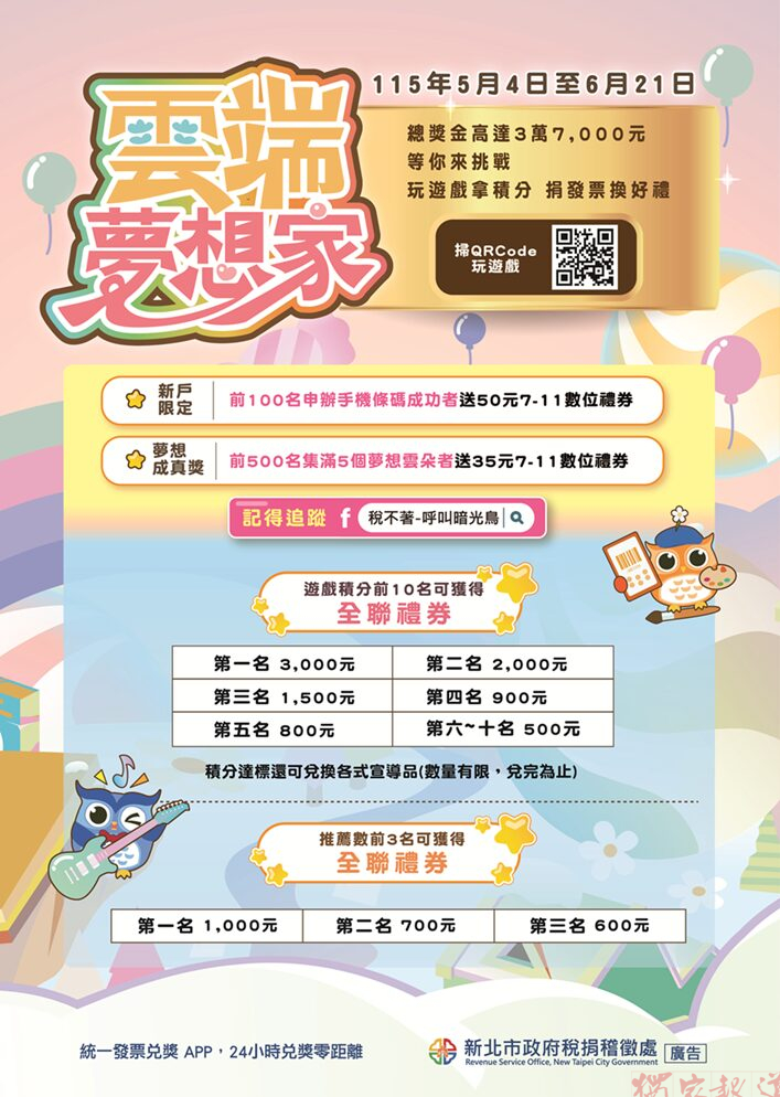 新北市政府稅捐稽徵處將於115年5月4日至6月21日舉辦「雲端夢想家」網頁互動遊戲活動,結合跳躍挑戰、趣味解夢及蒐集雲朵等多元玩法,完成挑戰不僅可拿積分兌換宣導品,還有機會獲得全聯禮券及7-11數位禮券,快來參加吧!