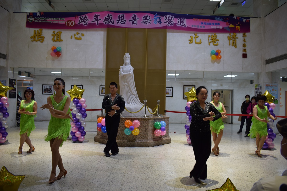(雲林新聞)【記者洪佳伶、蘇榮泉/雲林報導】中國醫藥大學北港附設醫院今日舉行為期5天的「跨年感恩音樂舞饗週」,每年由朝天宮國樂團來院舉辦公益演出,今年受疫情影響延期至歲末,結合雲林海線多組音樂團體、舞蹈團體,如萊杯音樂會、閃亮樂團、公益輪椅國標舞老師蔡秀慧等,透過優美的音樂聲、美妙的歌聲,以及精采豐富的國標舞蹈表演,治癒鄉親的心靈、撫慰疫情動盪的情緒,也讓在地樂團、舞團散播幸福與歡樂,從北港媽祖醫院開始,健全身心、快樂迎新年。