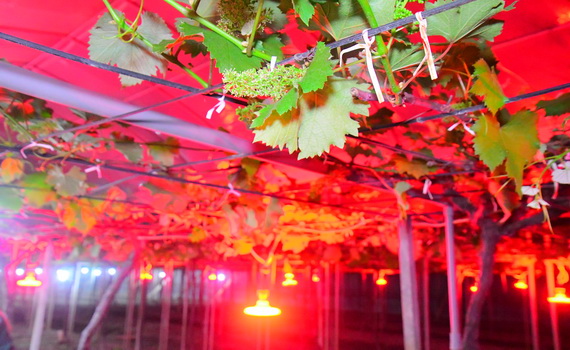 「這不是耶誕燈火,是農業專家新研究出以紅光LED燈向上照射出成型的幼小葡萄果粒」園主陳三郎解釋介紹說,以往為穩定授粉後成為果粒的葡萄穩定度並加速其成長所採用的光,就會以當做是日間光線的白色燈光在夜晚持續照射而達成效果。但近幾年農業專家研究發現,以紅色LED燈光照射的效果比白光更優數倍。所以他不惜採購比白光燈貴5倍的紅光LED燈,安置在日間陽光照射比較不足的區域而讓明年的早春葡萄的小小葡萄寶寶每晚紅光滿面的快快長大好搶先上市為溪湖爭光。