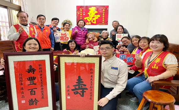 (南投新聞)【記者石振賢/南投報導】時值歲末年終之際,喜逢南投市榮民人瑞耿致祥爺爺百歲壽辰!南投縣榮民服務處由處長邱奇賢帶領處内同仁、榮欣志工及役男等,特地前往耿爺爺府上祝壽,並邀請南投市長宋懷琳、軍功里長吳安妮及華山基金會南投區社工一同恭賀爺爺百歲嵩壽!席間邱處長代表轉贈總統、行政院長祝壽賀屏及輔導會主任委員的賀壽平安金飾,以及榮服處致贈營養補充品禮盒,並準備壽桃分享來賓,祝福壽星及參與活動每位嘉賓平安健康,南投市長、華山基金會及軍功里長也致贈壽禮及獻上賀詞,家屬利用這難得的機會與眾來賓合影,場面溫馨熱鬧、洋溢歡樂的氣氛。