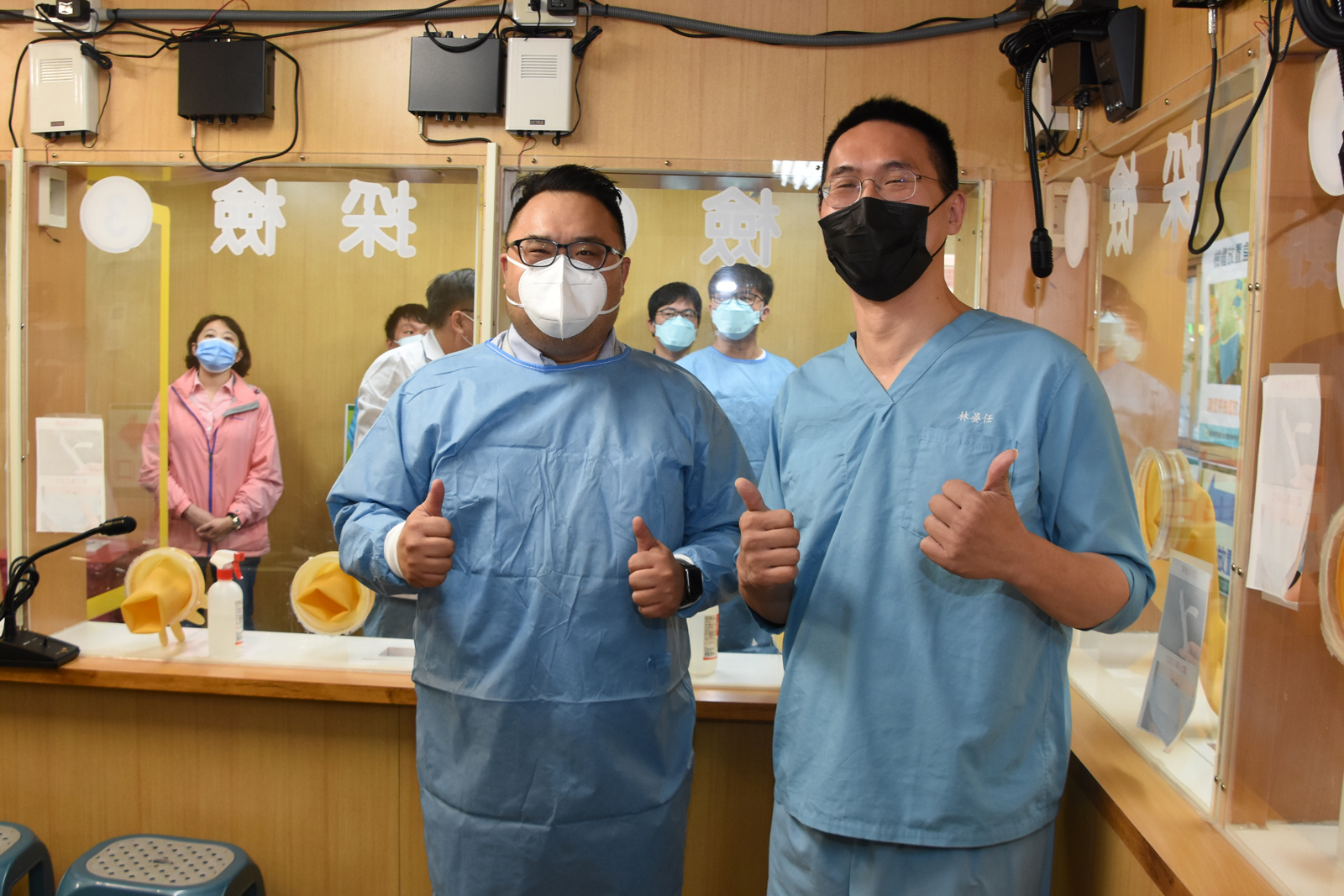 ▲林晏任醫師(右)指出,採檢站全自動消毒系統,能使採檢站的防護零死角、運作速度提升三倍。