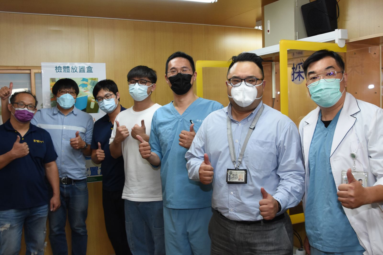 ▲廖倫德博士(右一)表示,彰基COVID-19採檢站的全自動消毒系統,是全台灣第一套針對採檢站安裝的消毒系統。