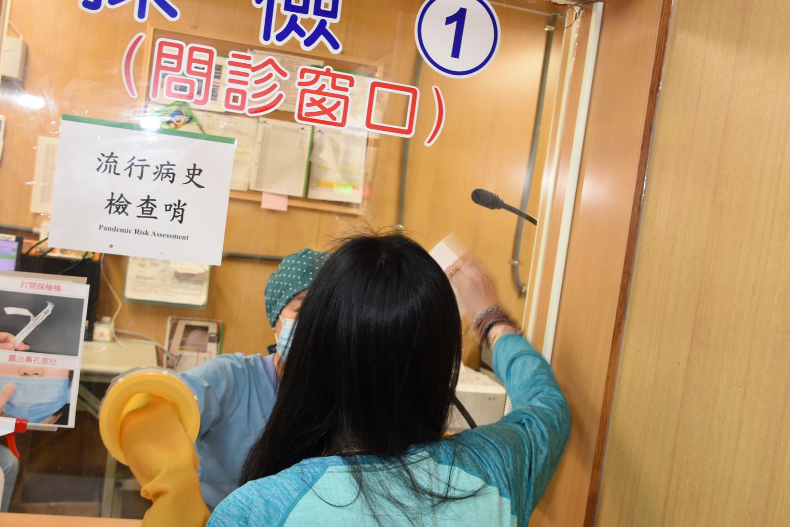 ▲以往採檢都需要花費額外人力,請人在後面做清消動作,或是請民眾與醫護一起協助清消。