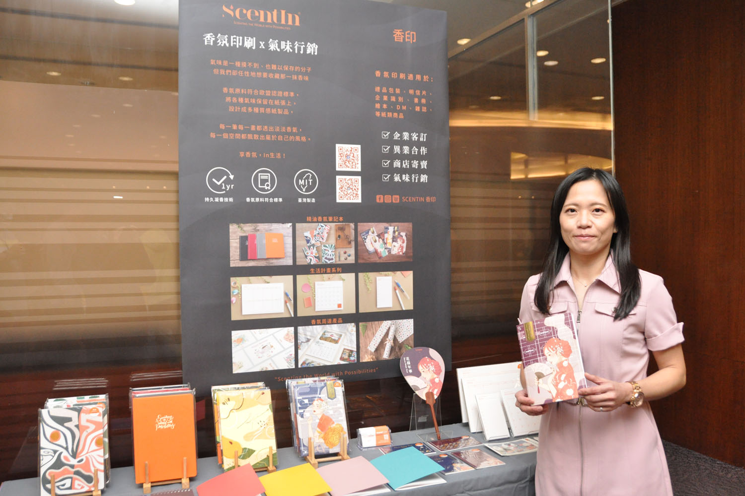 ▲宏國群業張卉芸說明專利香氛印刷技術的應用範圍。