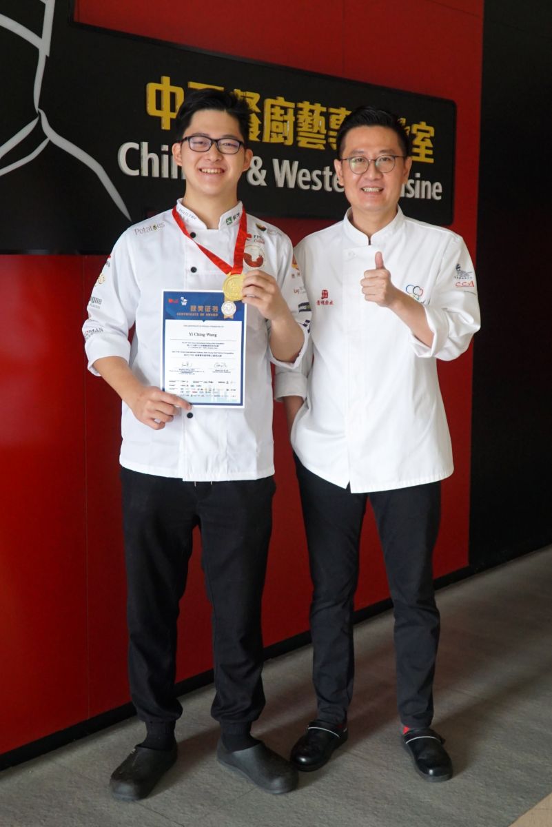 ▲大葉大學餐旅系金牌選手王羿晴(左)感謝彭建治老師指導。