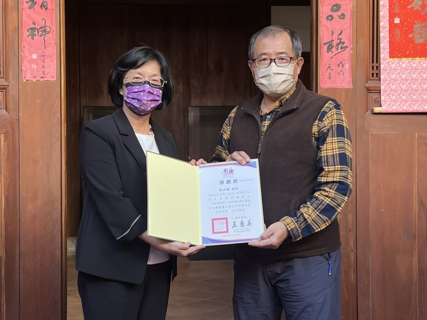 ▲縣長王惠美親自頒發感謝狀給施世曈藝師。