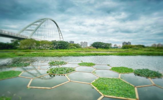 ▲濕地獨有的「新北濕地水禮服」,將木條編織成六角造型於濕地水面上,是本次規模最大的鋪面作品。
