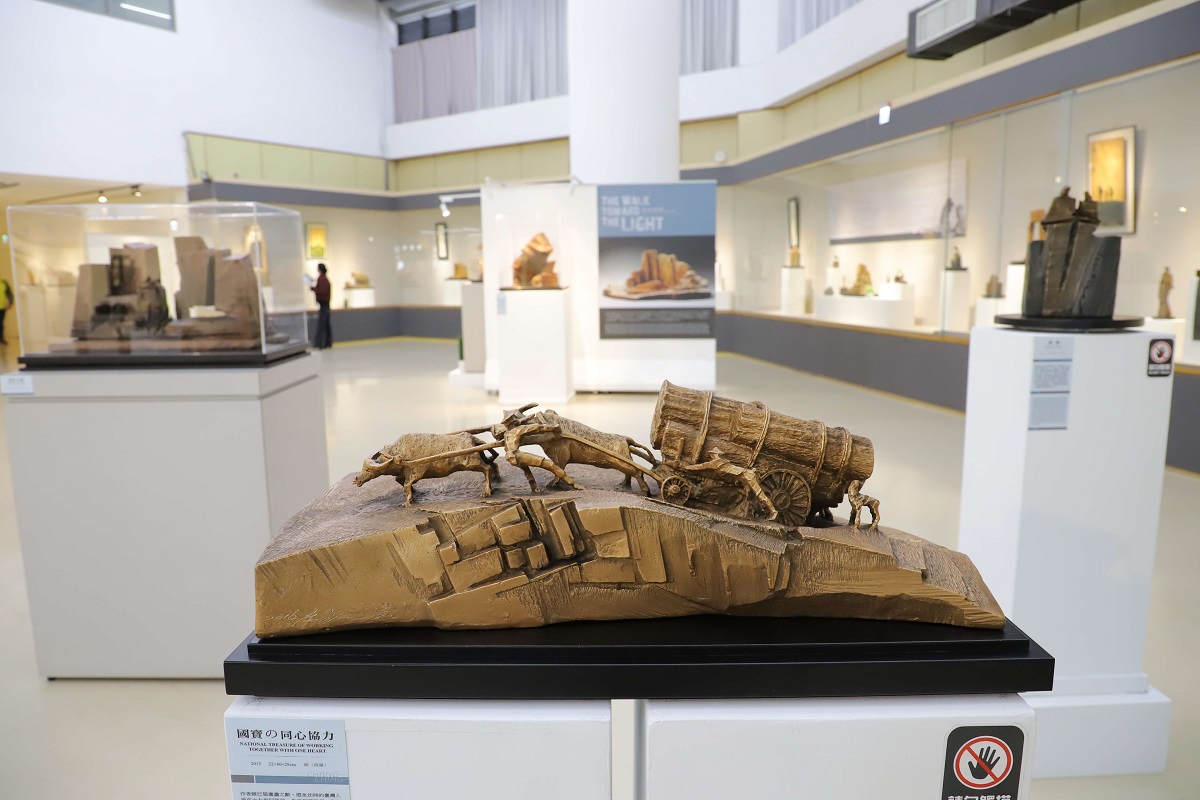 文化觀光處長陳璧君表示,大師創作36年來,足跡橫跨各公私部門與學校機構,除了最為精擅的木雕原作,亦有銅雕與大型戶外公共雕塑藝術、公部門獎座主體等作品,題材多元豐富,處處可見大師對於不同主題,揮灑淋漓的神來之藝。本次展出近60件作品中,可看到大師以斧劈出具山水意境的大山大水,鏤刻出最真摯靈性的人物形貌,值得一提的是,大師創作的特殊媒材—臺灣國寶級「古木倒格柴」,為具有千年歷史,經長期風化等自然作用下帶有豐富油質的古木心材,不僅質地較一般木材更為穩定,因醇化作用帶有天然香氣,外表滿布深刻的風化痕跡,經大師巧手善用,讓老木材起死回生,化腐朽為神奇,脫胎成具有新生意義的一件件藝術品,更為一絕。