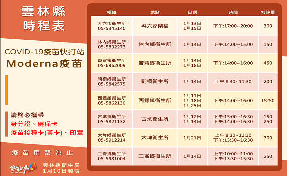 ▲雲林縣明(1/11)天起,於西螺、古坑、麥寮、北港等衛生所開設快打站,提供縣民「免預約、隨到隨打」接種服務。(圖/記者洪佳伶翻攝)