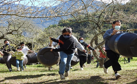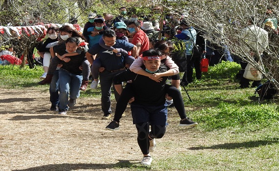 (南投新聞)【記者石振賢/南投報導】南投縣花卉嘉年華重頭戲─信義鄉農會梅子夢工廠踏雪尋梅主題日熱鬧吸客,除在知名賞梅區柳家梅園以精彩舞團及原鄉歌舞表演迎賓,更舉辦親子挑橡木桶及甜蜜負擔「夫妻揹負競速」大賽,其中夫妻揹負競速戰況激烈,前三名分別獲得被揹者體重公斤數,全額到三分之一的金牌烏梅酒大獎,為整場活動掀起最高潮。