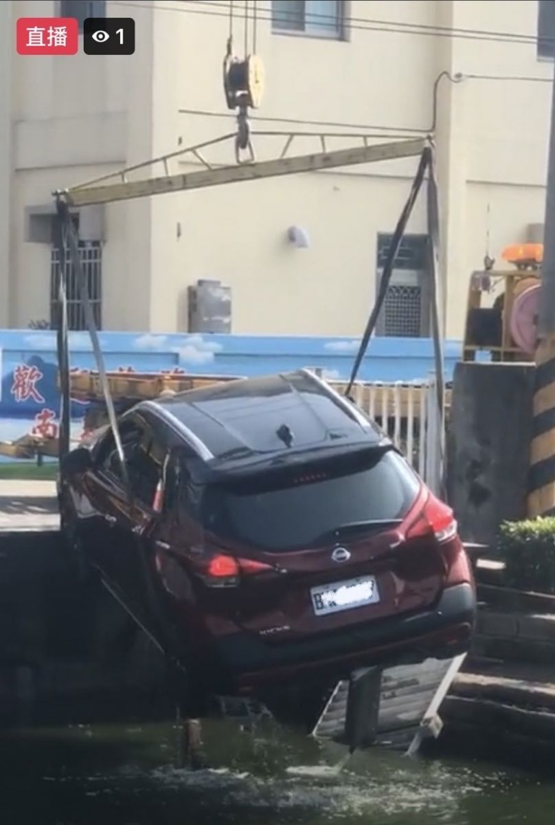 ▲車子「砰」一聲急速倒退嚕,掉落景觀池,幸好女駕駛迅速脫困,沒多久車子拖吊上岸,懊惱太不小心,直呼「真殺風景。