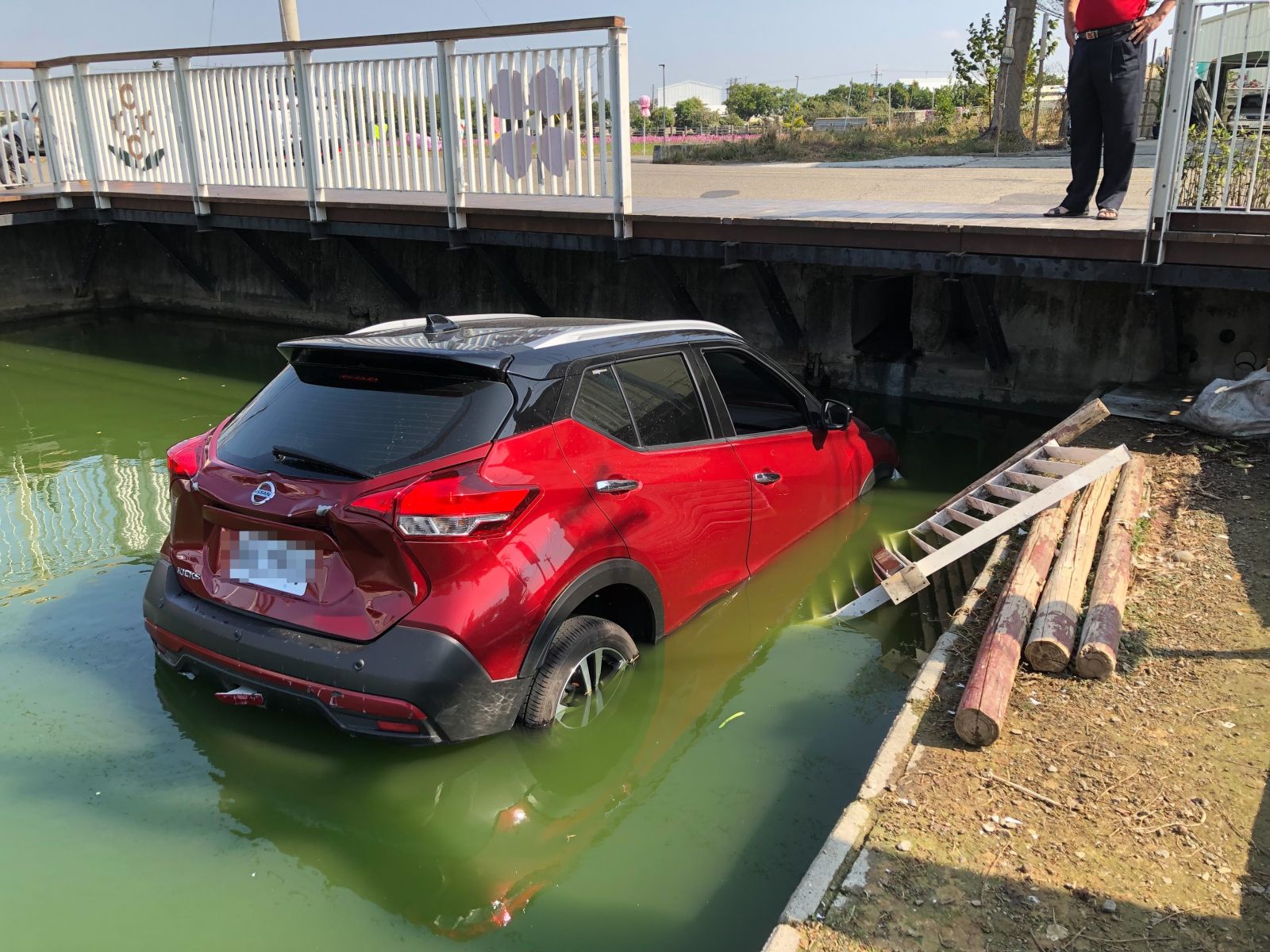 ▲來自台中夫妻駕車慕名來賞花,不料妻子倒車要停車,誤踩油門,車子「砰」一聲急速倒退嚕,掉落景觀池,幸好女駕駛迅速脫困。