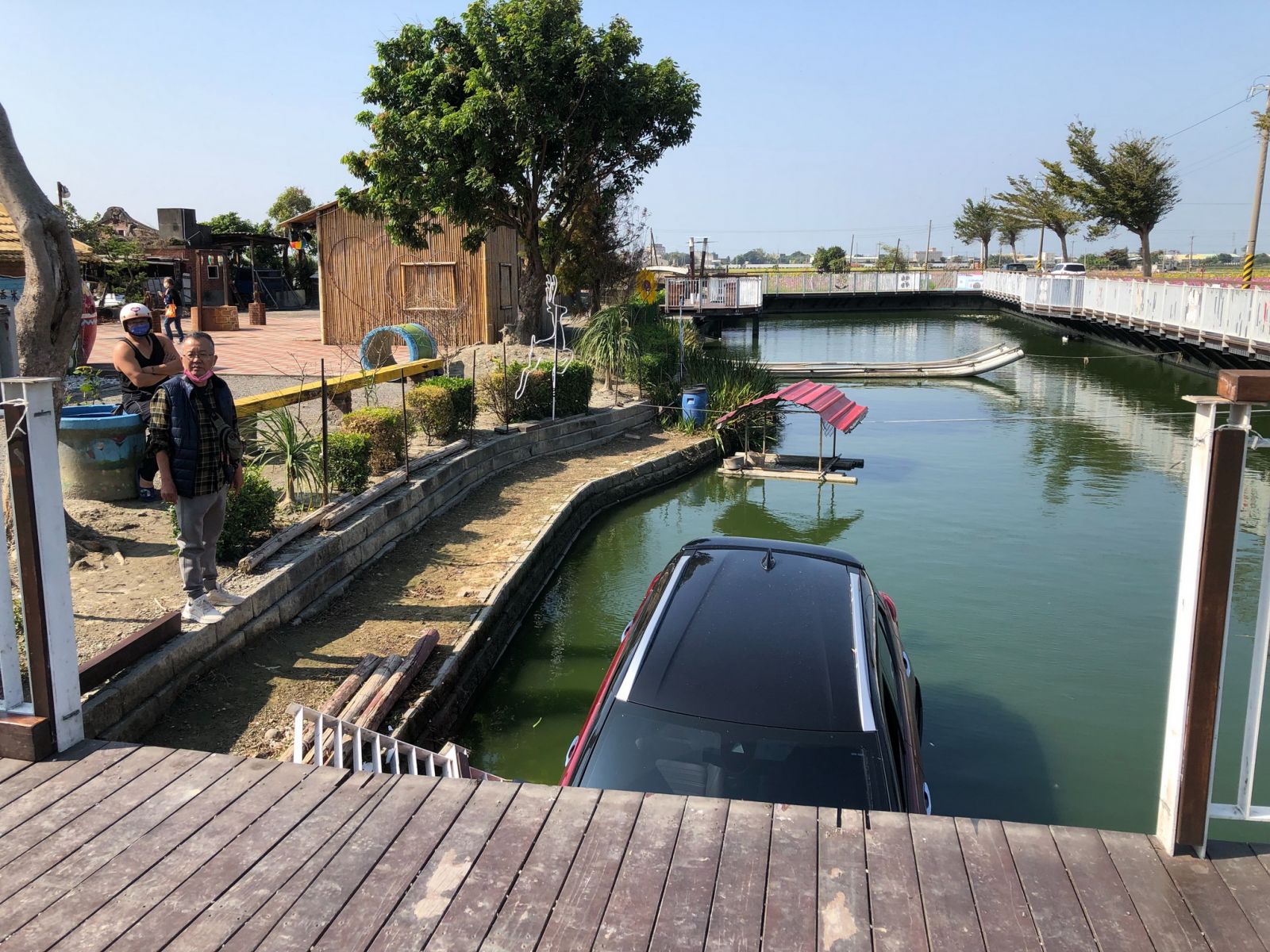 ▲一休旅車到彰化縣埔鹽鄉南新村欣賞花海,女駕駛倒車要路邊停車時,油門誤踩太猛,車輛撞破路旁護欄,整輛車掉落路旁景觀池。