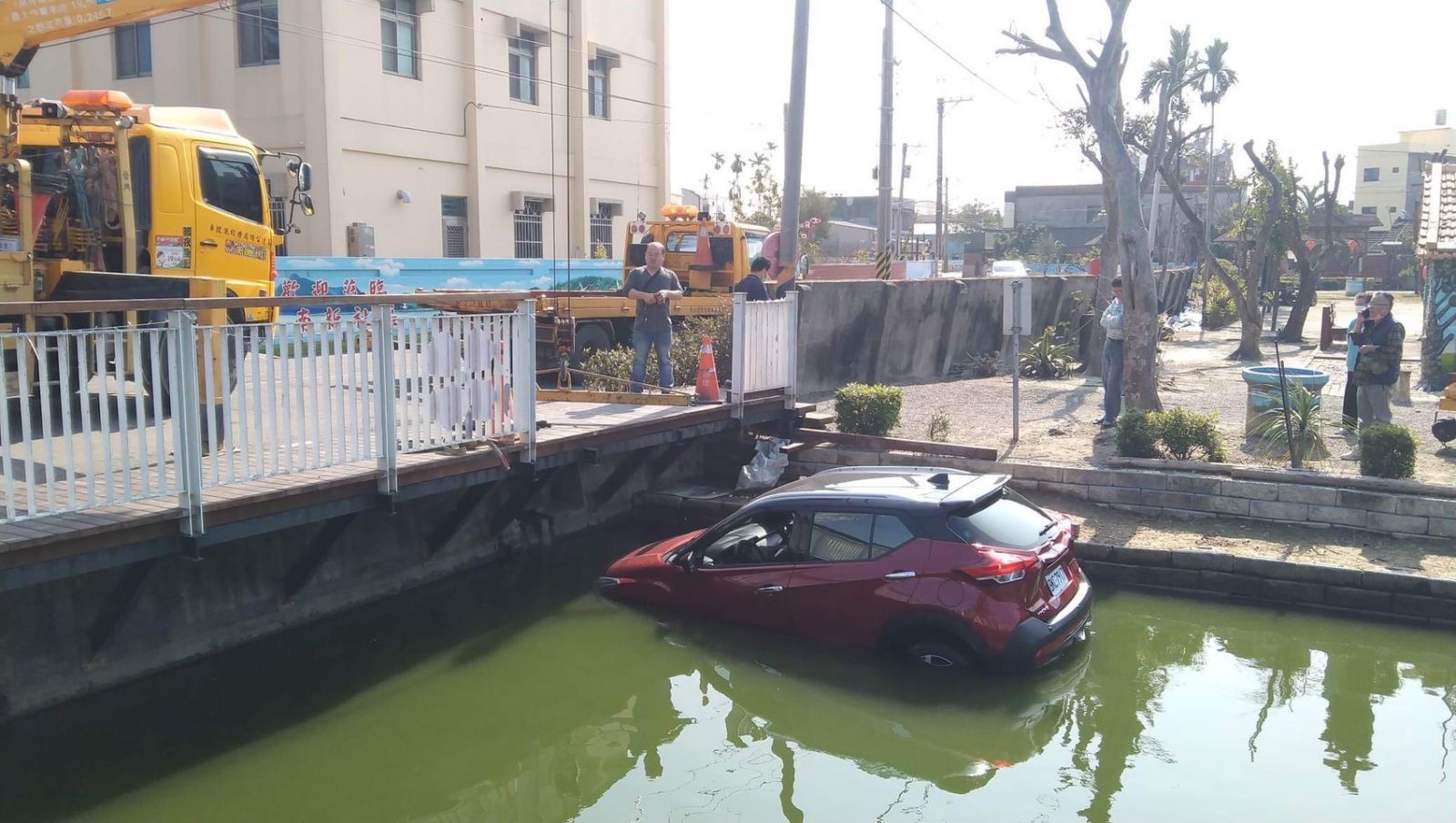 李姓女駕駛和先生隨即通報拖吊車前來,將掉落景觀池的車輛吊起,幸好這起事故未造成任何受傷,只是該對夫妻花沒賞到車就先泡湯,先生說,人沒事就好。
