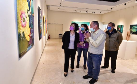 ▲彰化縣長王惠美等人參觀彰化縣鹿江詩書畫學會2022年會員聯展。