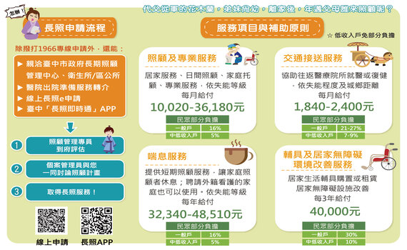 衛生局表示,春節期間提供的長照服務,包括居家照顧服務、日間照顧服務、家庭托顧服務、專業服務、輔具及居家無障礙環境改善服務、交通接送服務、喘息服務等,請提前於今年1月21日前預先提出申請,以利調度安排服務人員。
