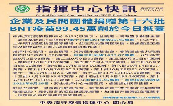 中央指揮中心說明指出,由台積電、鴻海暨永齡基金會、慈濟基金會共同捐贈的BNT疫苗1,500萬劑,目前共計到貨1433.07萬劑,分別為首批9月2日93萬劑、第二批9月9日91萬劑、第三批9月30日54萬劑、第四批10月1日67萬劑、第五批10月4日27萬劑、第六批10月7日88.92萬劑、第七批10月8日88.92萬劑、第八批10月14日82.7萬劑、第九批10月28日90.21萬劑、第十批10月29日91.03萬劑。