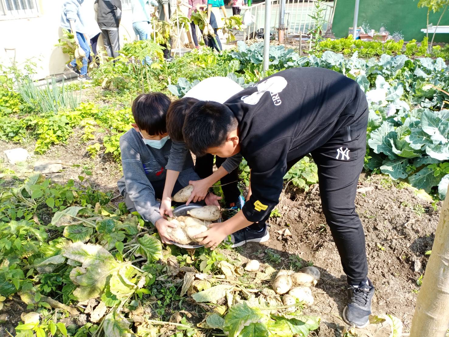 ▲趕在過年前,彰化縣二林鎮香田國小安排六年級學生手作菜頭粿,師生到生態田採摘自己栽種的蘿蔔。