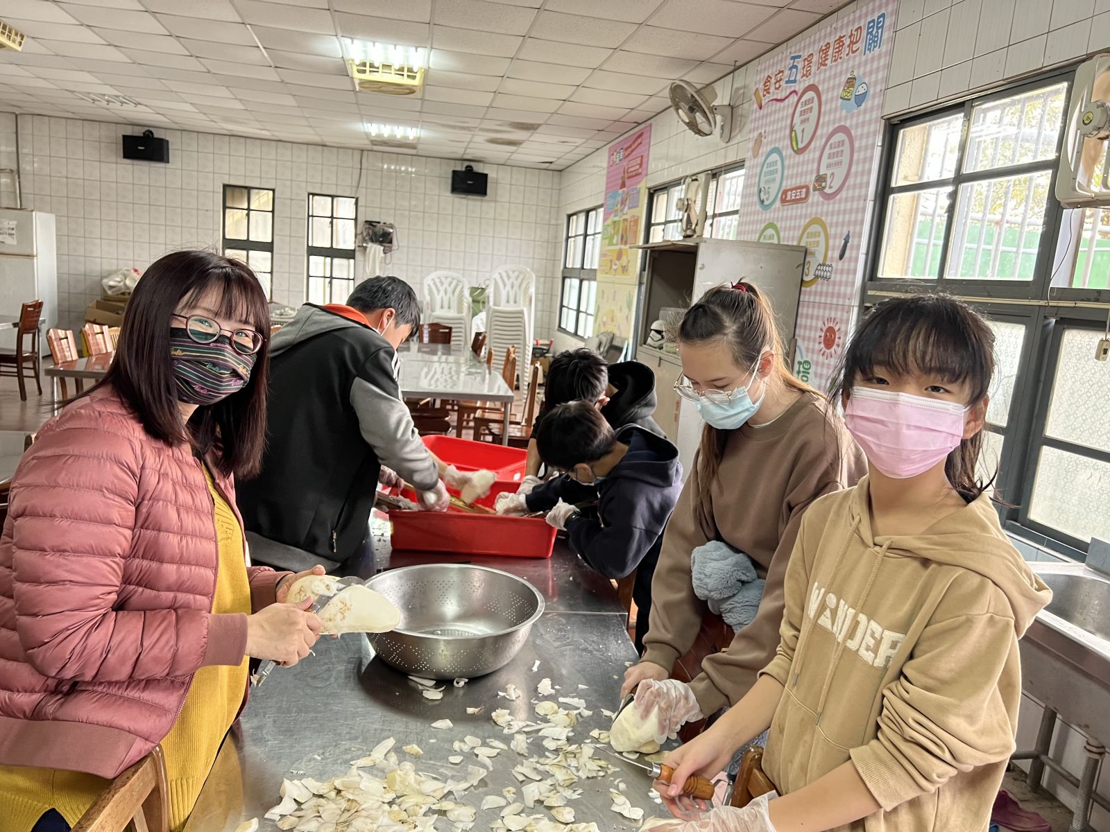 ▲六年級學生採收種了兩個多月的蘿蔔,在廚媽指導下,一批同學在餐廳削皮。