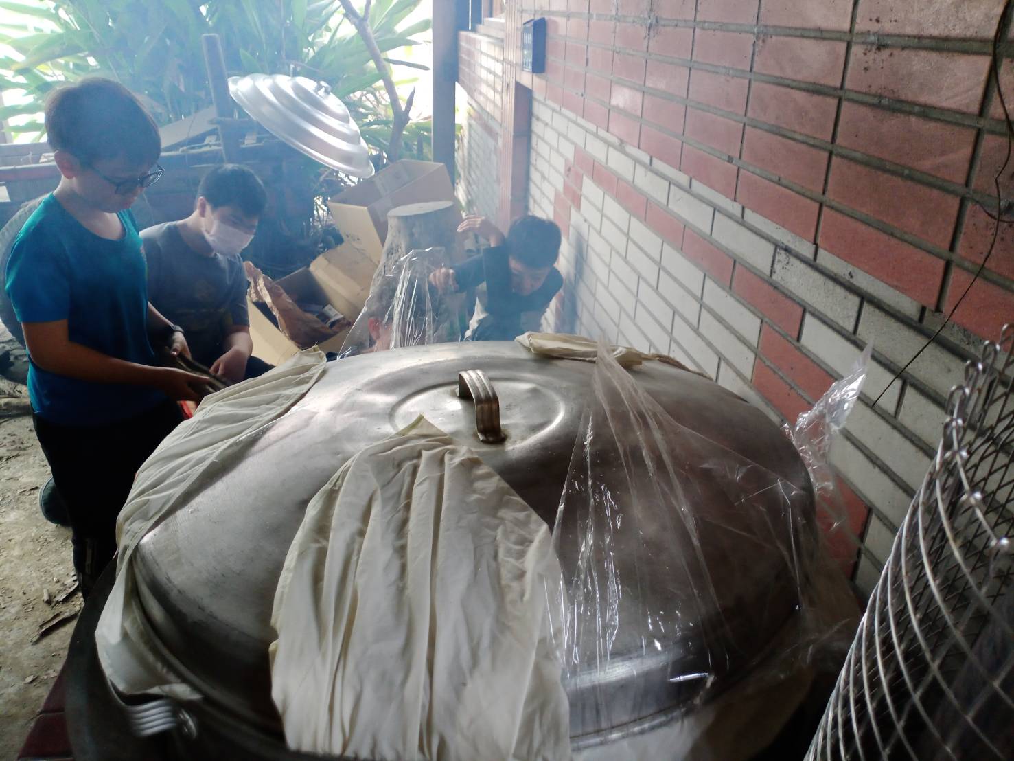 ▲學生炒好的菜頭配料攪拌均勻,一起倒在蒸籠裡,再搬到大灶炊粿。