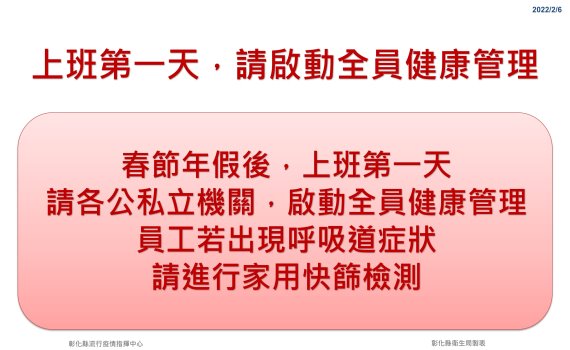 ▲彰化縣政府呼籲各公私立機關春節年後上班第一天,主動啟動全員健康管理。