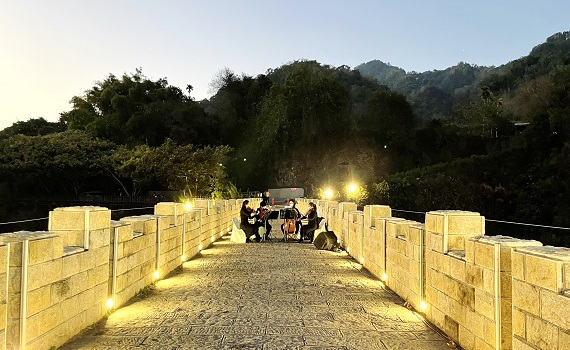 在古樸的石橋光廊上,以古典、台灣民謠、探戈及西洋老歌等17首組曲,演奏90分鐘輕快優美的弦樂;手持一杯國姓咖啡,沉浸在北港溪畔夜晚徐徐微風中,點亮國姓客庄最亮眼的光彩。